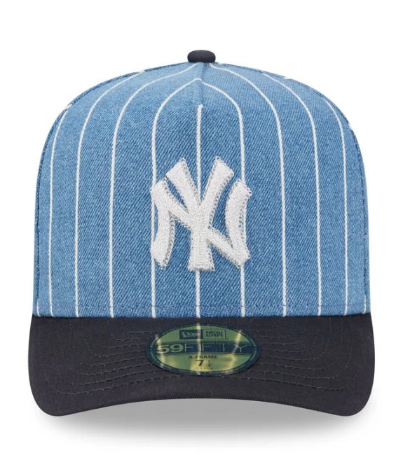 The New York Yankees Parallel 59FIFTY A-Frame Fitted Cap features an embroidered Yankees parallel stitch logo at the front panels against a denim pinstripe fabrication throughout. Additional details include a matching MLB Batterman logo at the rear and a gray undervisor.