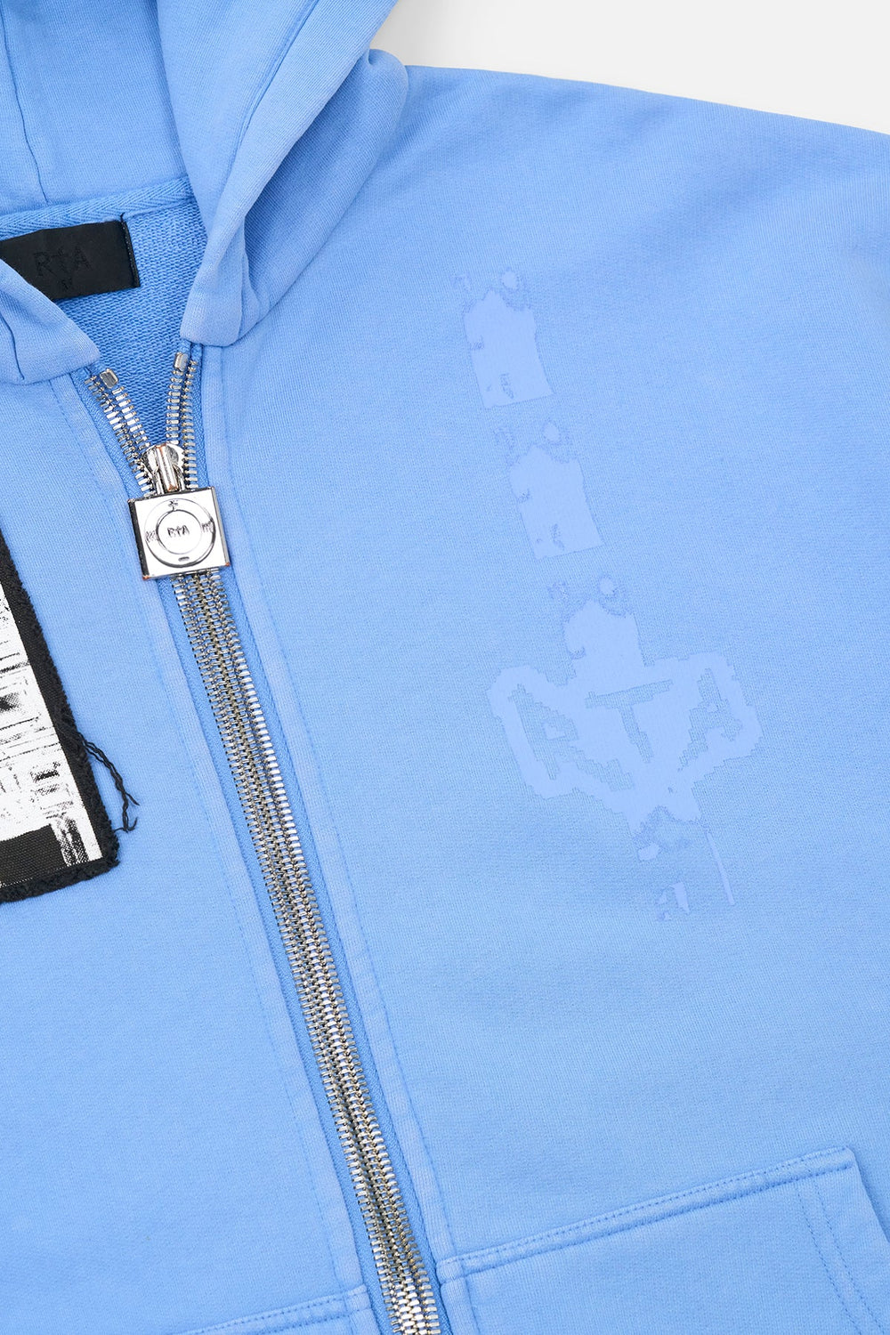 The Zev Zip Up Hoodie in Blue Digital Patch is made from 100% Cotton. This hoodie features a unique Mp3 player zipper, our signature double zip tape, front pockets, embroidered graphic patches, and a pixelated RtA logo on the chest.